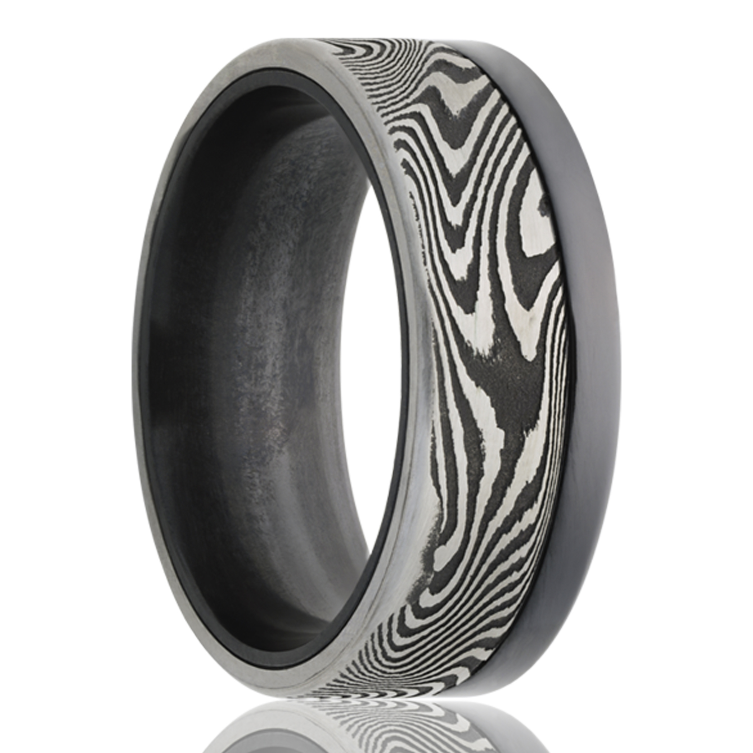 Zirconium ring with a satin finish and a damascus overlay. Select width and size then add to cart.
