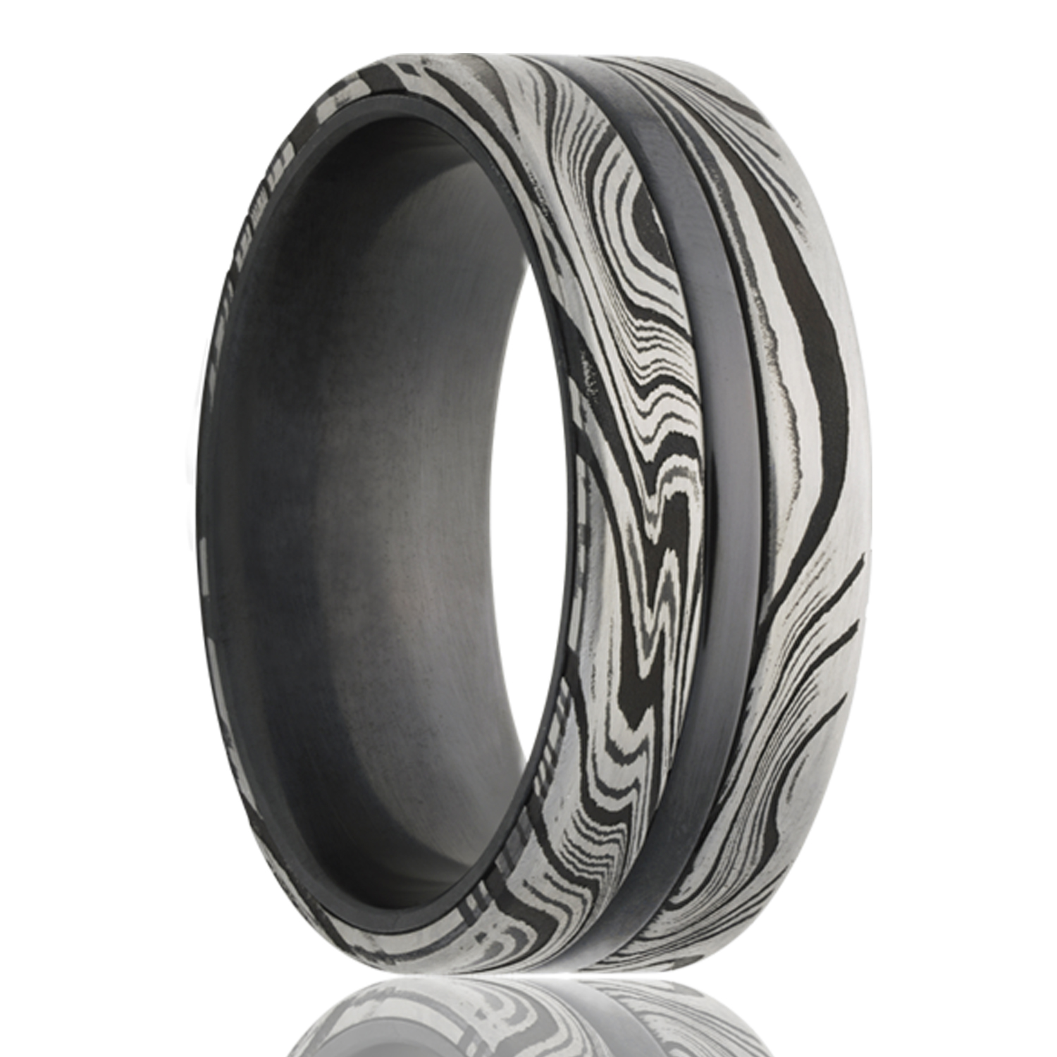 Zirconium ring with a satin finish and two damascus overlays. Select width and size then add to cart.